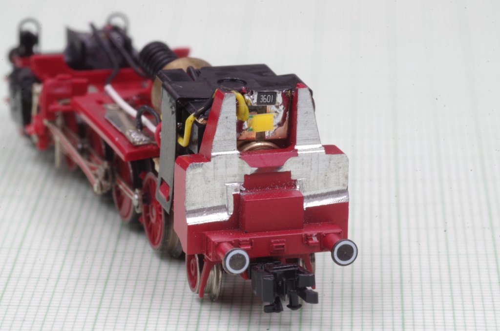 Oben ist ein Loch und ein Schlitz für die Motoranschlussdrähte, an der Seite eine Ausfräsung für den Decoder (ich wollte den freien Führerhausdurchblick erhalten).
