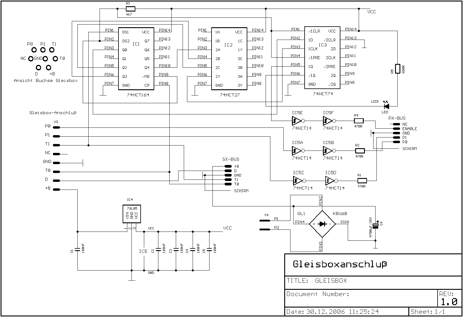 Am 8 - poligen Mini-DIN Anschluß der Gleisbox liegt zwar ein kompletter SX-Bus, aber beim PX-Bus fehlt das ENABLE-Signal, um die Gleisspannung der angeschlossenen Booster ein-/auszuschalten. Deshalb hier eine kleine Schaltung, um das fehlende ENABLE Signal aus dem SX-Bus zu erzeugen. Da die PX-Bus-Signale auch nicht so besonders sind, werden sie mittels einiger Inverter verstärkt und die Flankensteilheit erhöht, um auch längere Leitungen und mehrere Booster treiben zu können.