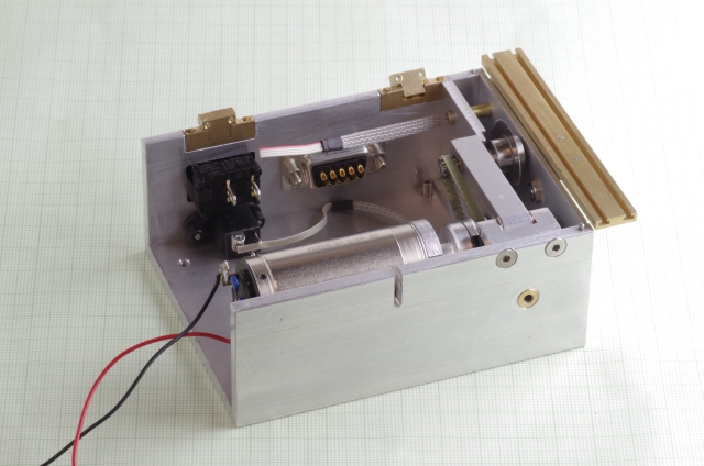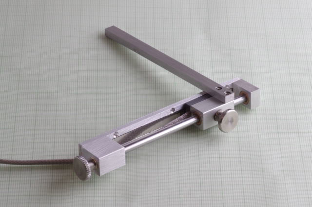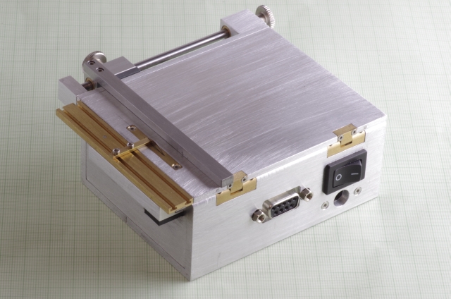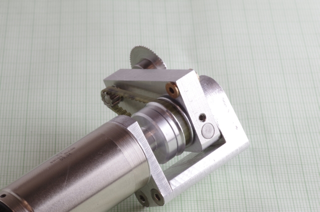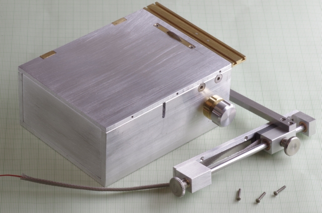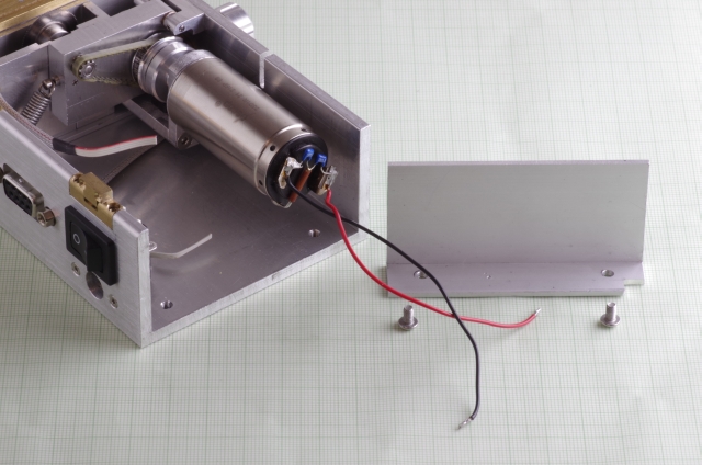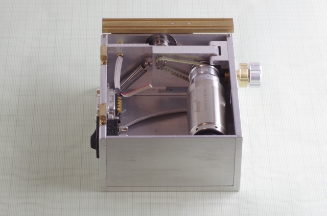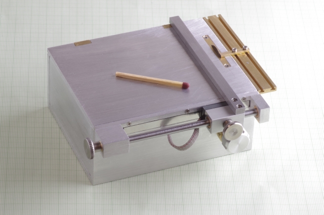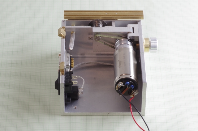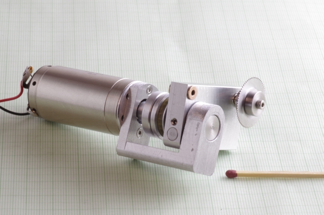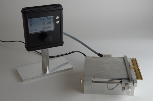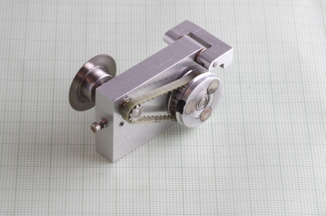 Ausgangspunkt war als Antrieb ein 6 Watt Escap Motor. Bei den Kreissägeblättern habe ich die kleinsten die ich bekommen konnte verwendet, Durchmesser 20mm. Der Motor treibt über eine Magnetkupplung (Schutz des Motors bei Blockieren des Sägeblattes) und ein Zahnriemengetriebe das Sägeblatt an. Das Werkstück wird über einen mit einer Linearführung versehenen Schlitten bewegt, der Schlitten hat zwei T-Nuten. Der seitliche Anschlag kann mittels einer Schraube genau eingestellt werden. Der Schlitten und der Anschlag sind mit einer Digitalanzeige mit 0,02mm Auflösung versehen. Die Motordrehzahl läßt sich einstellen. Über einen Drehknopf läßt sich die Höhe des Sägeblattes einstellen, maximale Schnitthöhe ist ausreichend für 2mm Messingprofile.