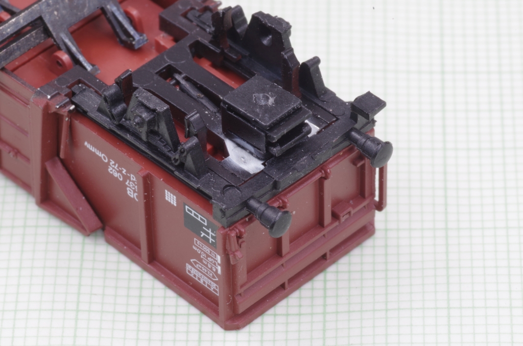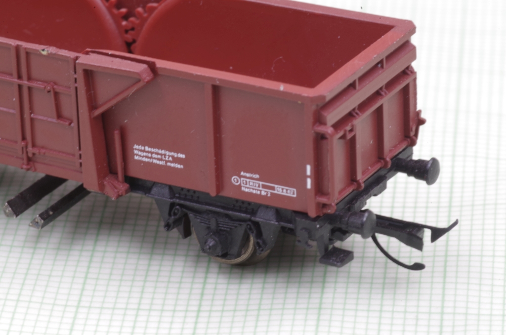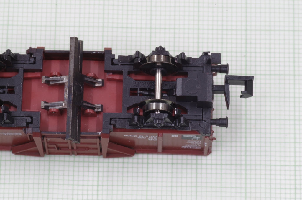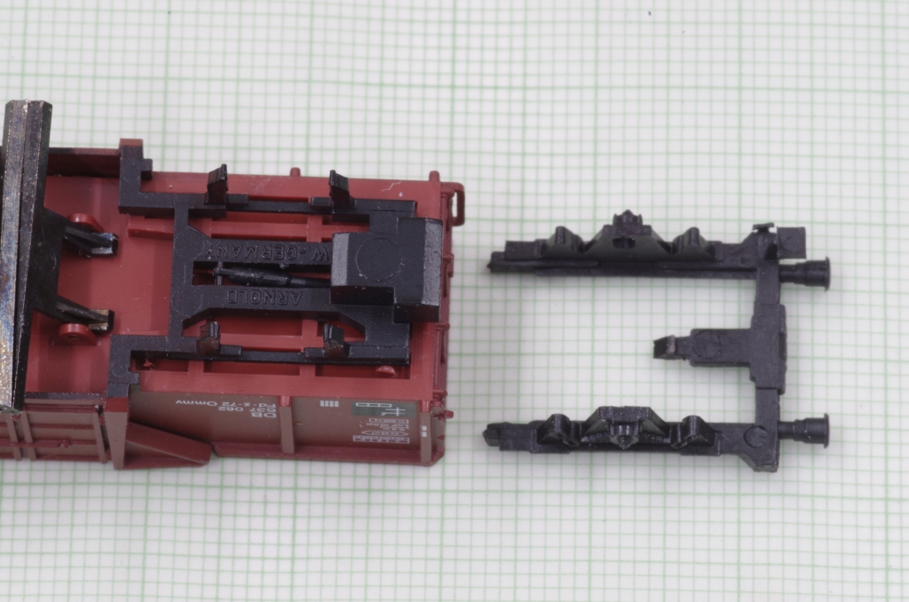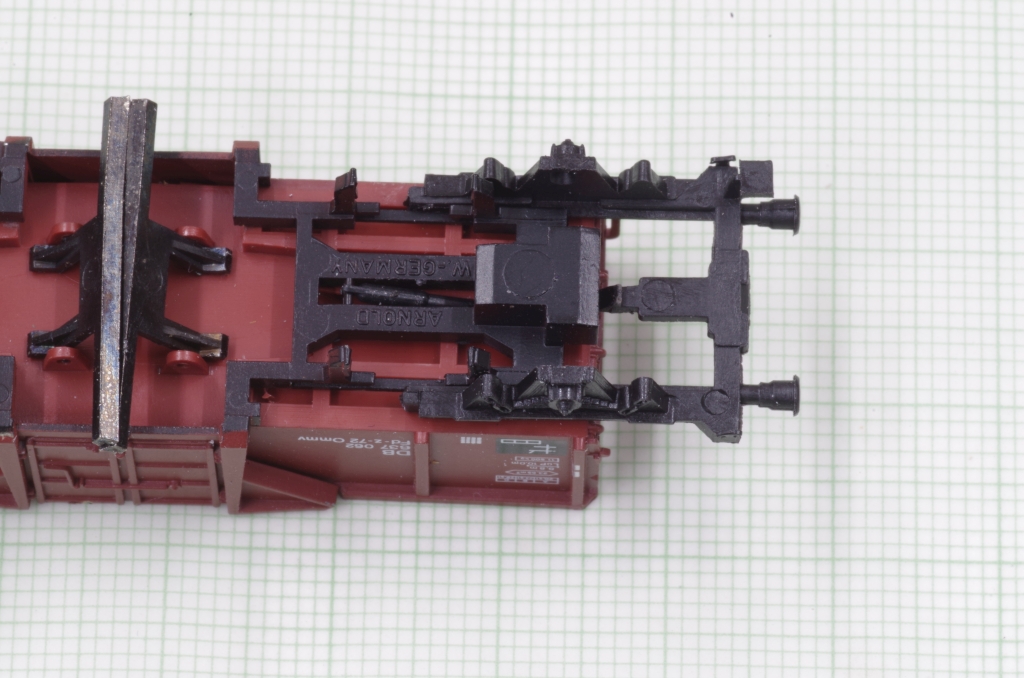 Der Arnold Mittenkippwagen 4484 gefällt mir sehr gut, auch wegen der Funktion. Es ist zwar schon ein älteres Modell, aber nicht schlecht, die Bremsbacken z.B. liegen in der Radebene. Aufgrund der Konstruktion des Wagens kann man leider keine KKK von Peho mit NEM Schacht einbauen. Was aber geht, ist, den Wagen mit einem NEM Schacht auszurüsten, damit hat man wenigstens die Möglichkeit, eine Kupplung nach Wunsch zu benutzen. Außerdem veringert sich der Kupplungsabstand etwas.