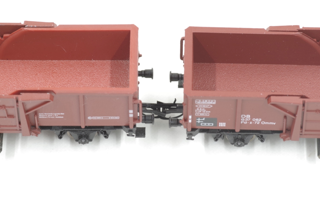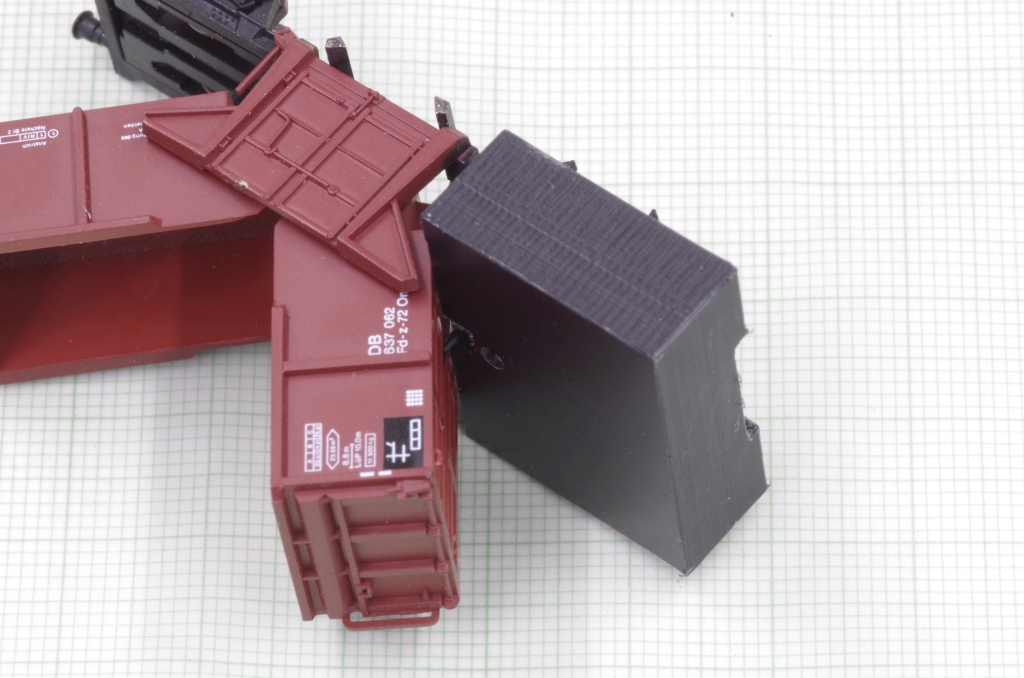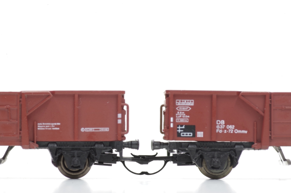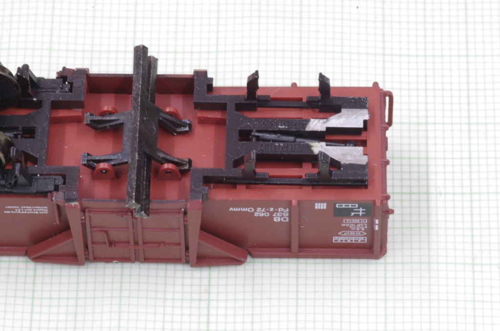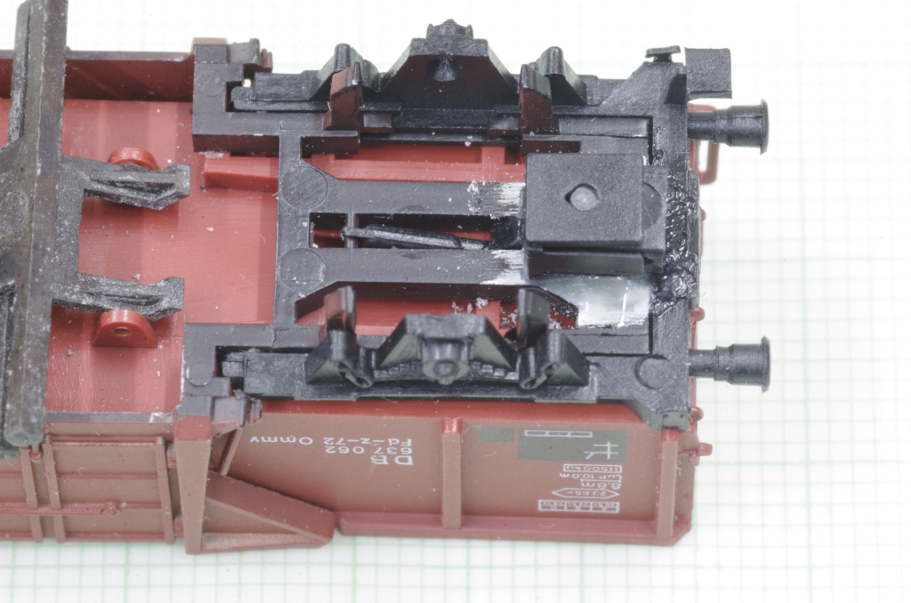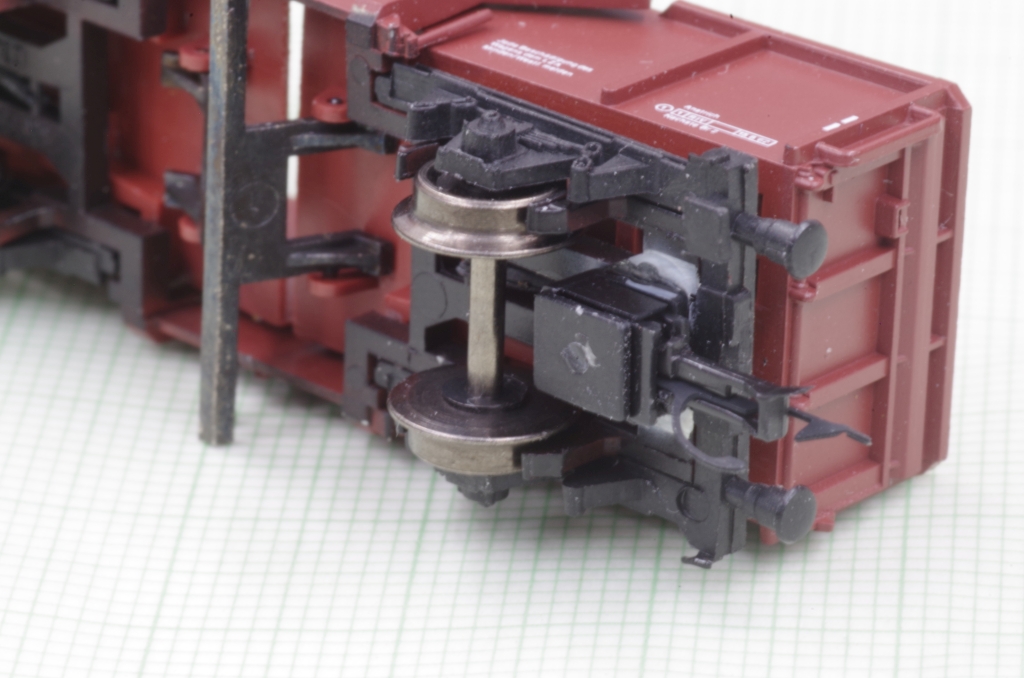 Der Arnold Mittenkippwagen 4484 gefällt mir sehr gut, auch wegen der Funktion. Es ist zwar schon ein älteres Modell, aber nicht schlecht, die Bremsbacken z.B. liegen in der Radebene. Aufgrund der Konstruktion des Wagens kann man leider keine KKK von Peho mit NEM Schacht einbauen. Was aber geht, ist, den Wagen mit einem NEM Schacht auszurüsten, damit hat man wenigstens die Möglichkeit, eine Kupplung nach Wunsch zu benutzen. Außerdem veringert sich der Kupplungsabstand etwas.