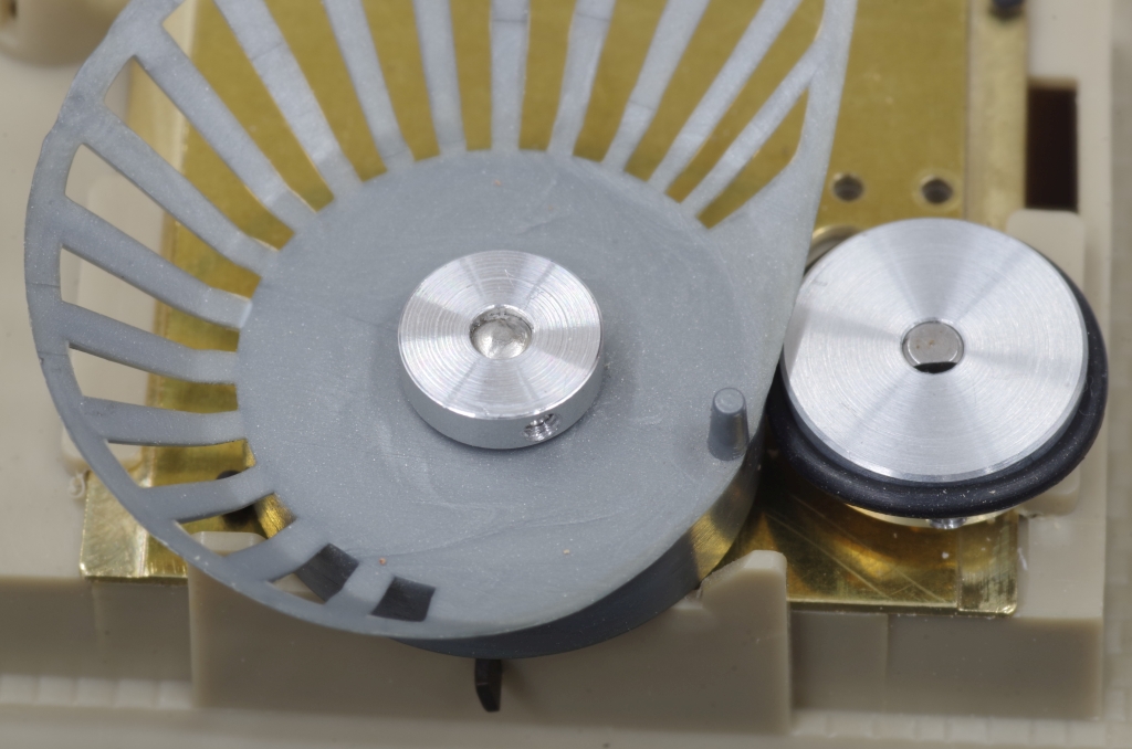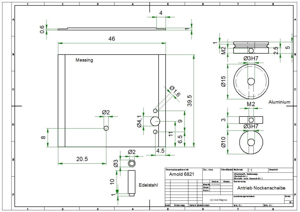 In die Nut der 15mm Antriebssscheibe wird ein O-Ring mit 14mm Innendurchmesser und einer Wandstärke von 1,5mm gelegt. Mittels einer Madenschraube M2x4 wird die Antriebsscheibe auf der Motorwelle befestigt. Ebenso wird die Scheibe, die ein Hochlaufen der Nockenscheibe verhindert, auf dem Stift befestigt.