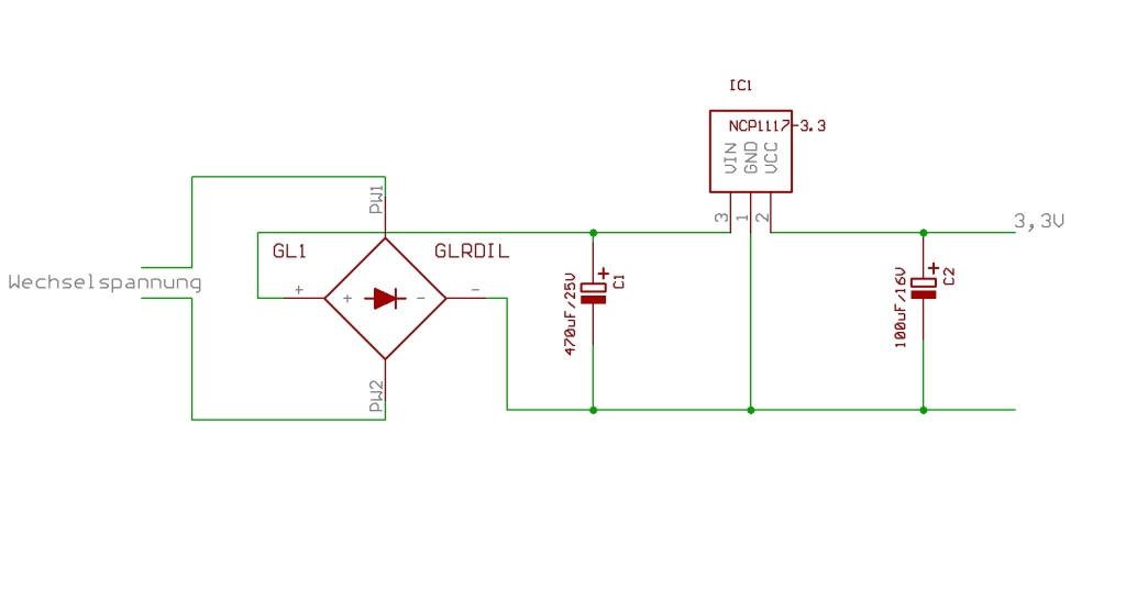 Die Wechselspannung wird an einen DIL Gleichrichter angeschlossen. Dahinter ist ein Elko (C1, 470uF/25V), dann ein 3,3V Spannungsregler (IC1 NCP1117-3.3 von ON Semiconductor, der verträgt auch 20 Volt Eingangsspannung). Dann folgt der Ausgangskondensator C2 (100uF/16V). Dort wird dann der Motor angeschlossen (Polung so, daß die Nockenscheibe sich entgegen des Uhrzeigersinns dreht).