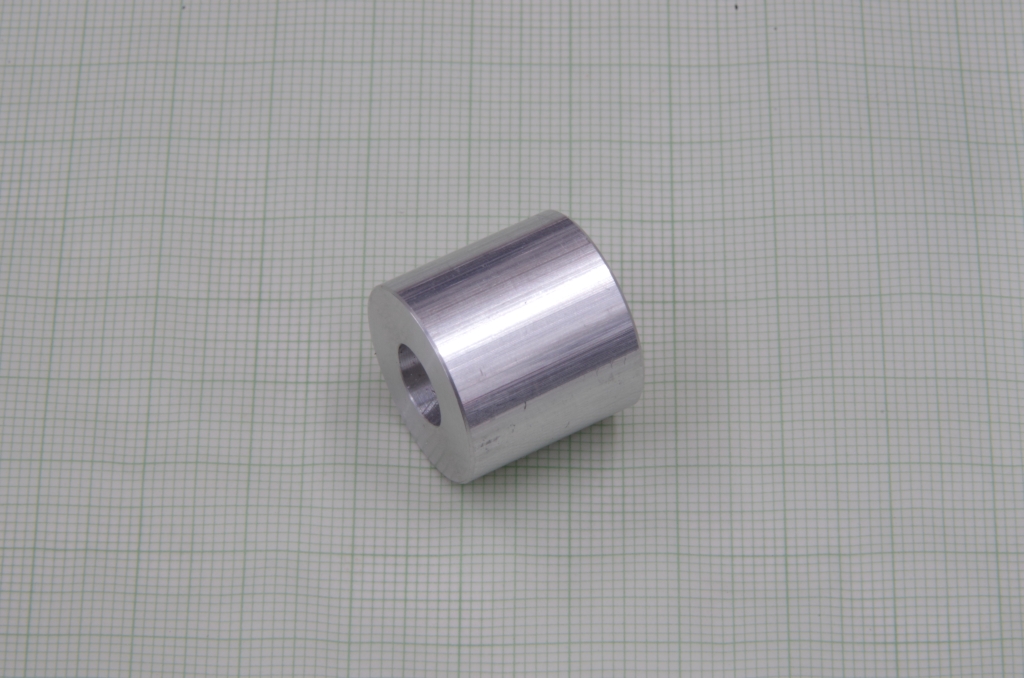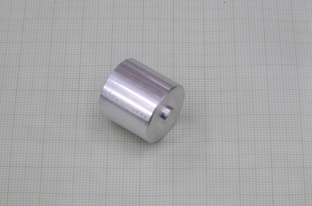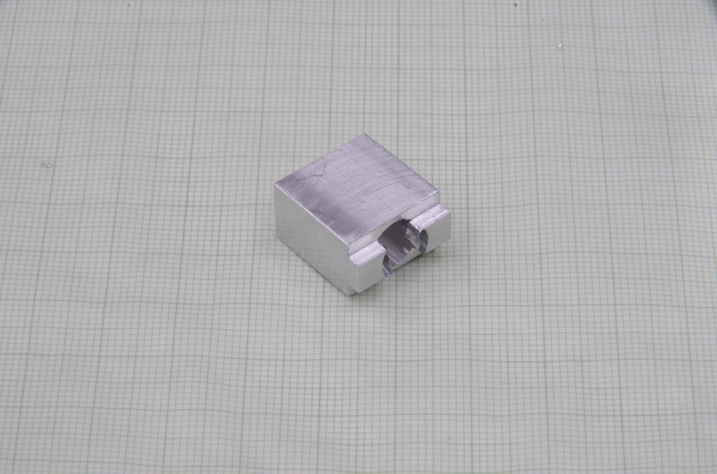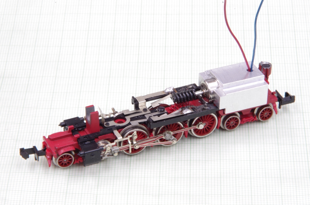 Also erstmal den Motor ausgebaut und mit Strom versorgt: läuft nicht. Kohlen ausgebaut: es fehlten bei beiden Kohlen die Andruckfedern. OK, Kohlen mit Federn gibt es als Ersatz, ein Glockenankermotor von DM-Toys ist aber auch nicht wesentlich teurer. Also einen GAM und einen Wellenadapter von 1mm auf 1,5mm bestellt. Die Schnecke vom originalen Motor paßt auf diesen Wellenadapter. Aus einem Stück Aluminium-Rundmaterial habe ich dann die Motoraufnahme gemacht. Aluminium statt Messing deshalb. weil der Motor ganz hinten sitzt und ich die Befürchtung hatte, daß die Lok mit einer schweren Messingaufnahme etwas hecklastig wird und die vorderen Treibräder keine gute Traktion mehr haben.