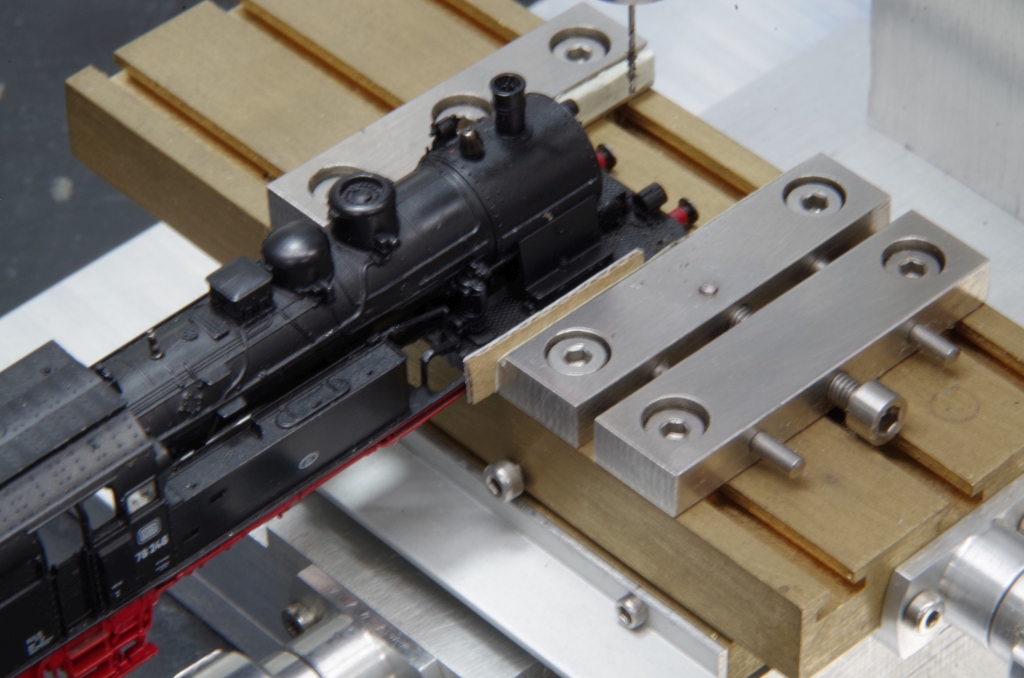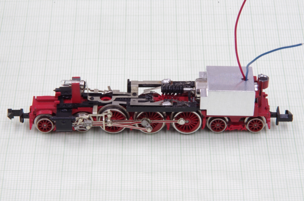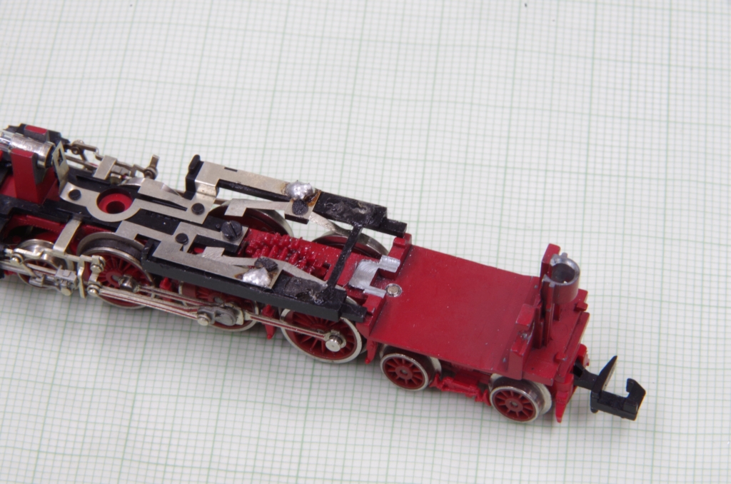 Da der GAM vorne etwas aus der Motoraufnahme herausragt, mußte ich noch etwas am Fahrgestell vor der letzten Kuppelachse wegfräsen.