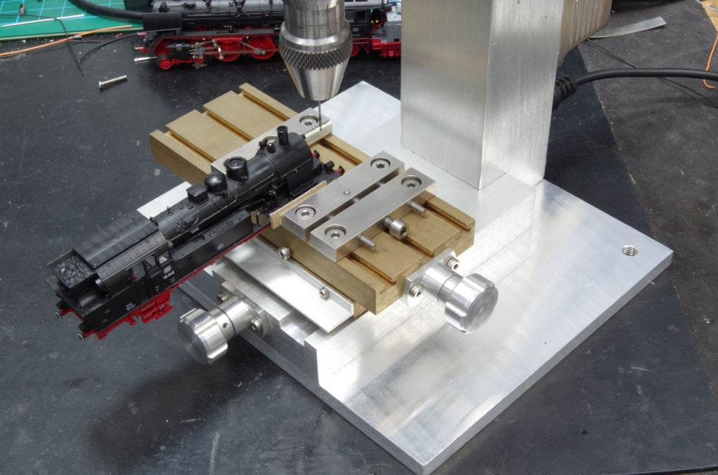 Etwas kniffeliger ist die Montage der neuen vier Haltestangen. Ich habe mir welche von der Fleischmann BR65 bestellt, die sind auch etwas filigraner. Es kommt nun darauf an, die Haltestangen auf beiden Seiten mit gleichem Abstand untereinander und zu den Seiten und der Vorderkante anzubringen. Dafür konnte ich gut meine vor ein paar Jahren gebaute kleine Bohrmaschine