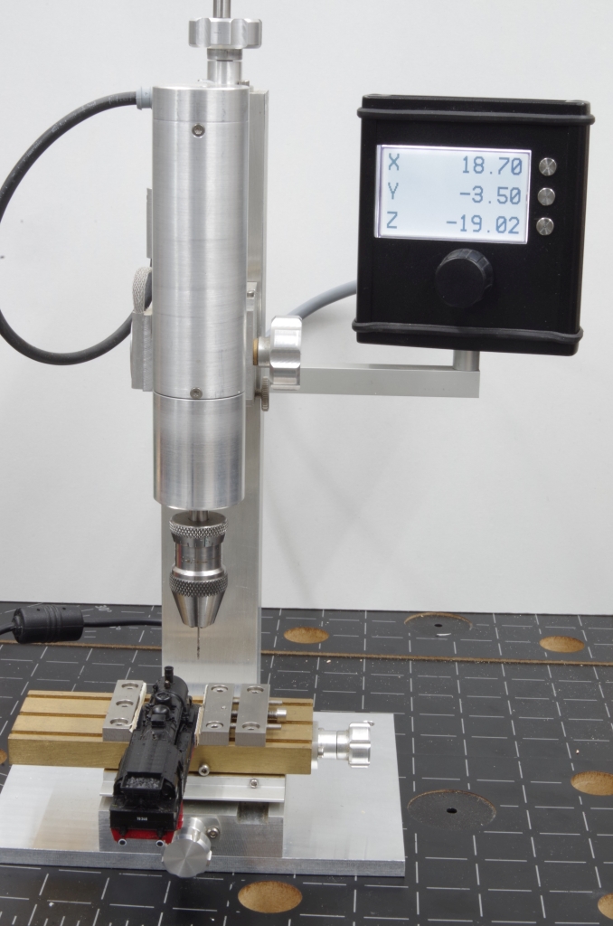 mit Kreuztisch und Digitalanzeige benutzen. Damit war es kein Problem, die vier Bohrungen von 0,7 mm passend anzubringen.