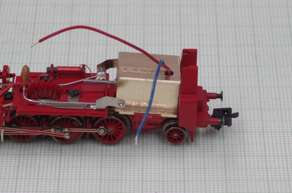 Die rote Leitung des Decoders und die graue VS Leitung habe ich unter dem Messingblock in der vorderen Aussparung an die andese Lokseite geführt. An den rechten Kontakt (Schiene)