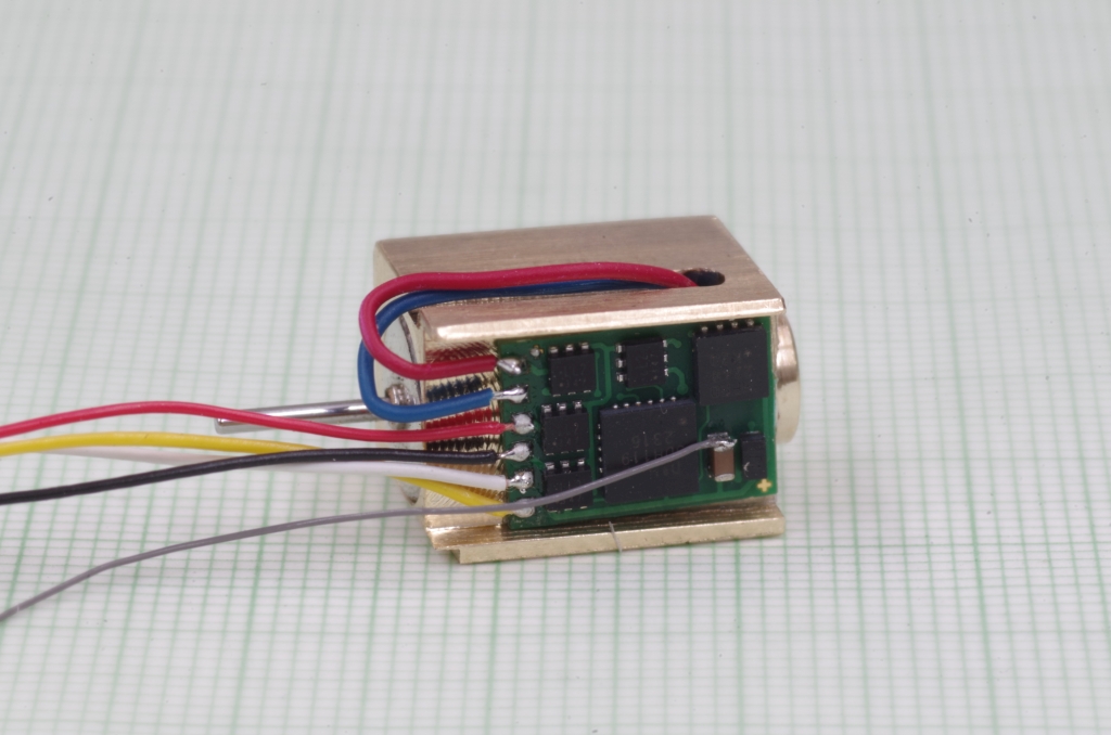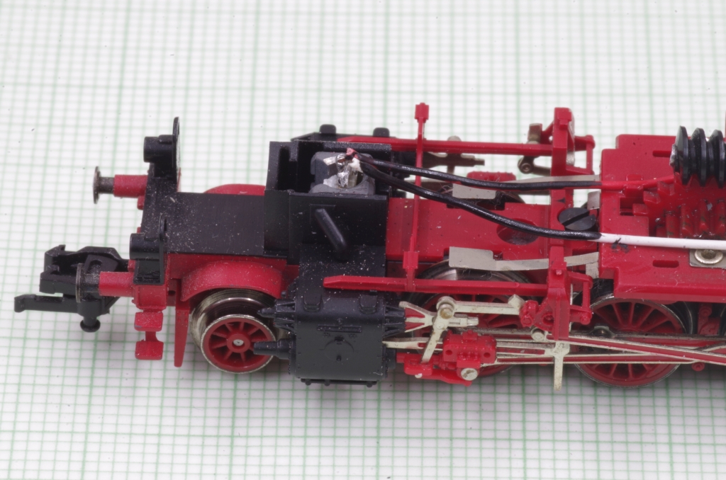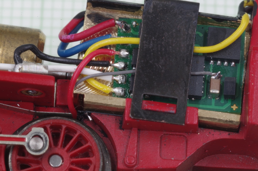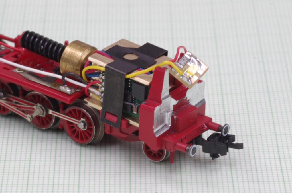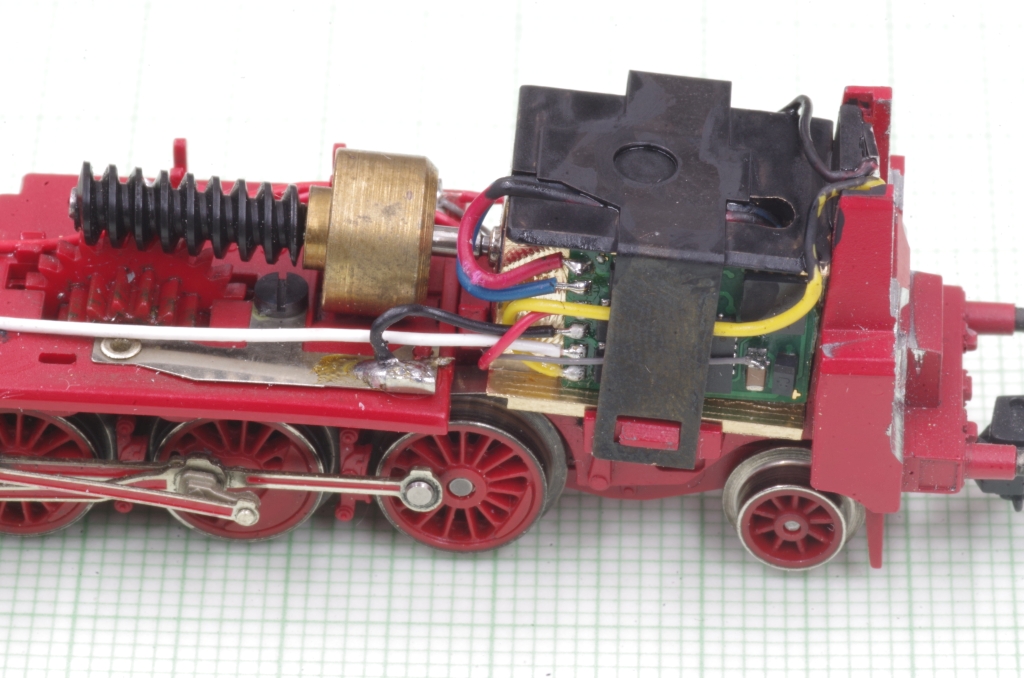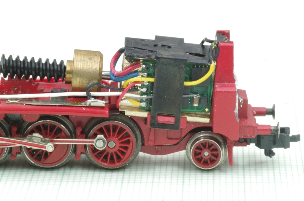 Der Decoder wird mit doppelseitigem Klebeband in die Ausfräsung geklebt, die Motorleitungen werden direkt an den Decoder gelötet. Der VS Anschluß des Decoders für die Anode der