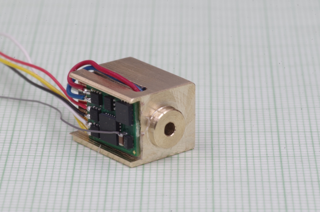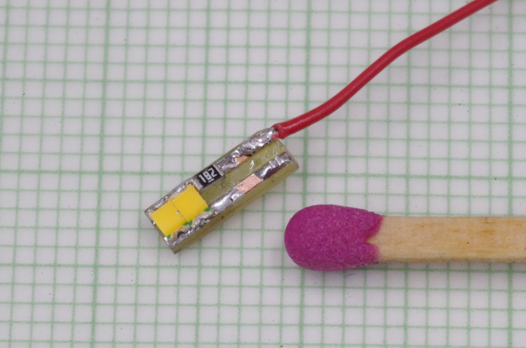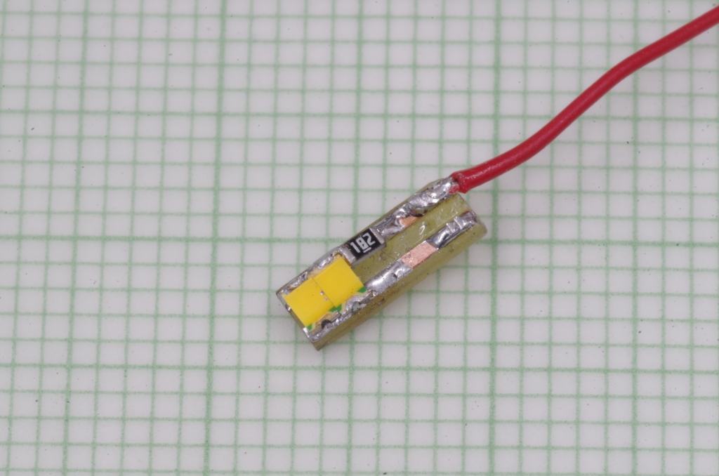 mit einer LED und einem Widerstand der SMD Baugröße 1206. Die Platine ist mit Sekundenkleber an den Messingblock geklebt.