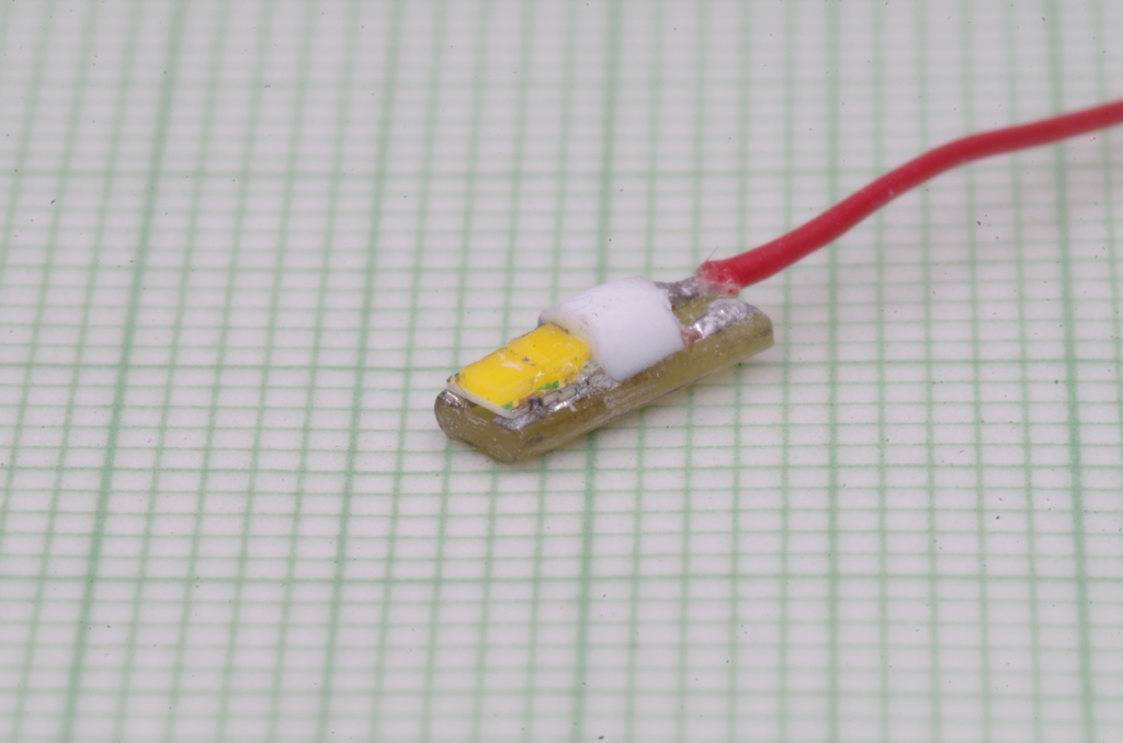 Stirnlampen, ein zweiter Lichtleiter für das obere Spitzenlicht) und diese eine kleinen Abstand haben, sind auf der Platine zwei LEDs direkt übereinander aufgelötet