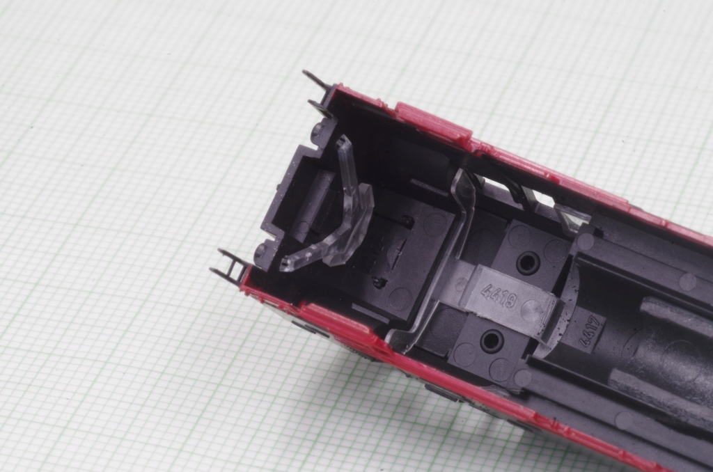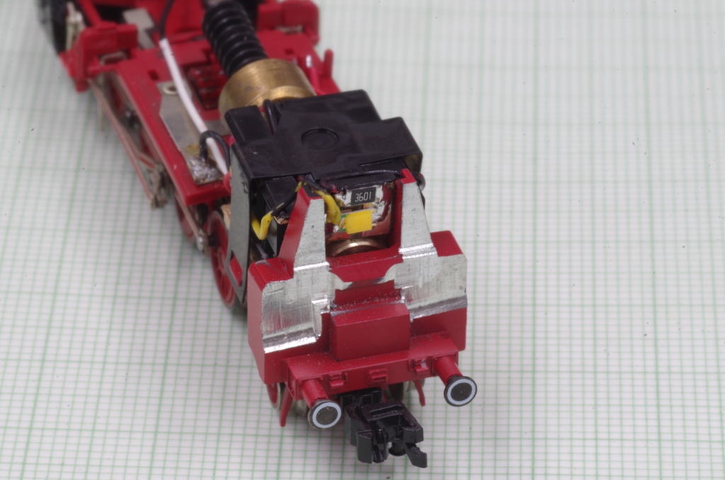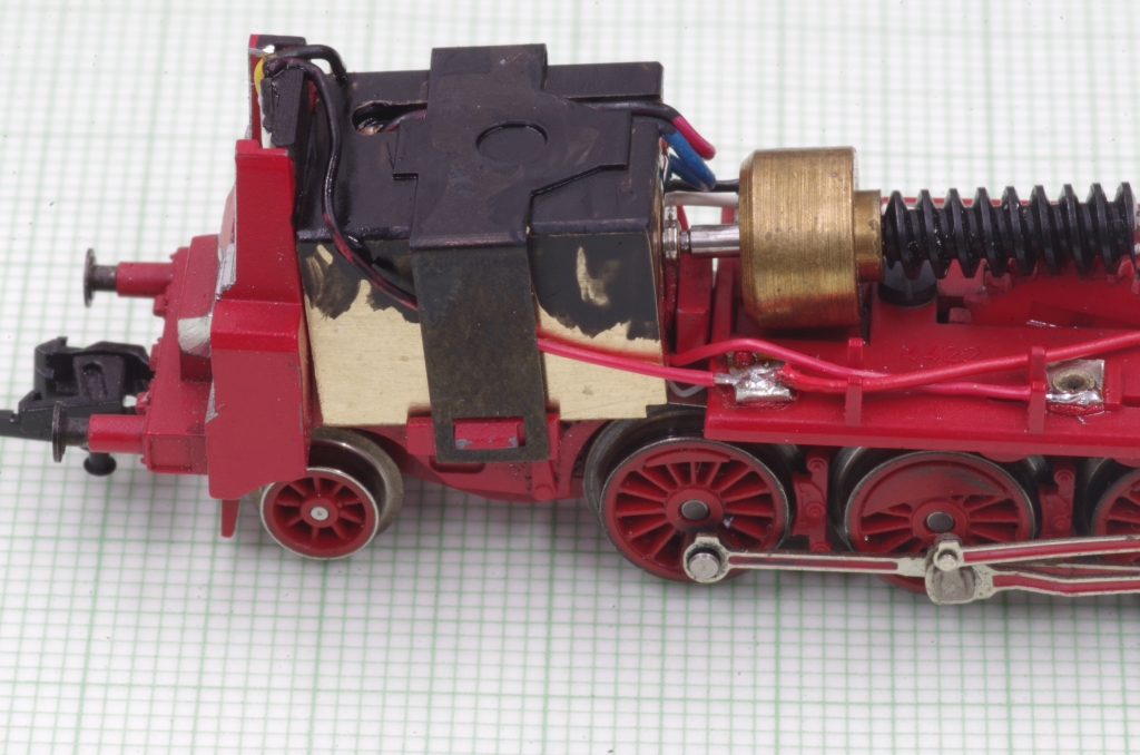Oben ist ein Loch und ein Schlitz für die Motoranschlussdrähte, an der Seite eine Ausfräsung für den Decoder (ich wollte den freien Führerhausdurchblick erhalten).