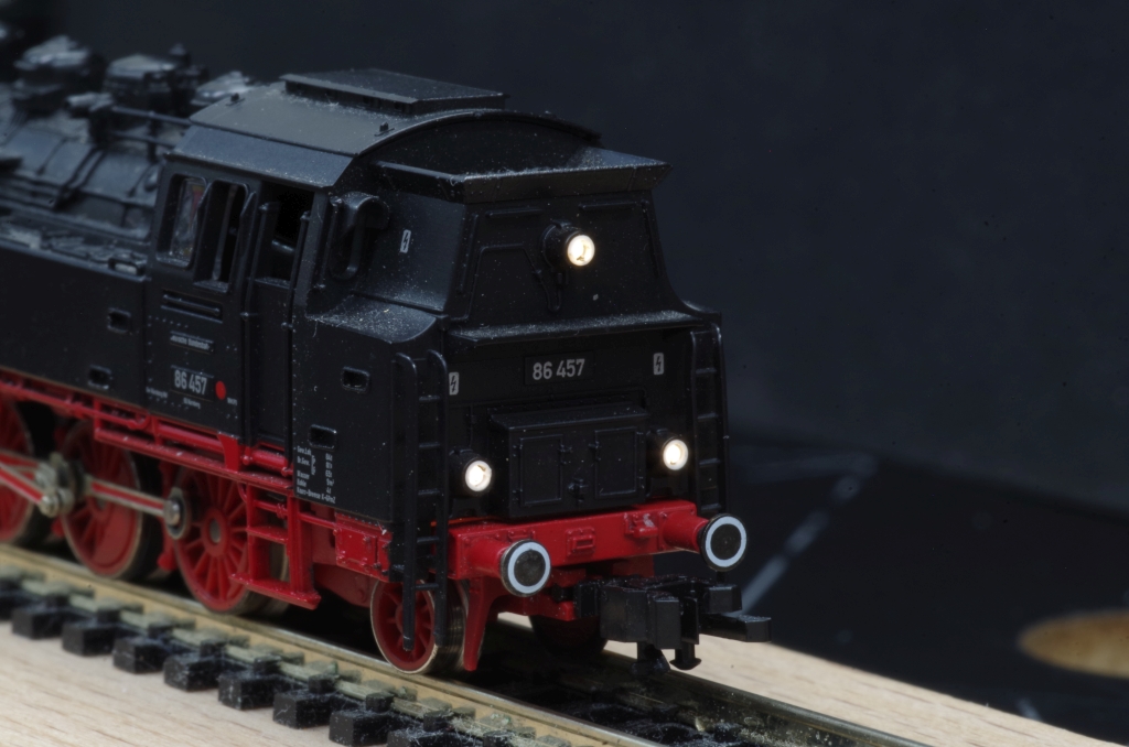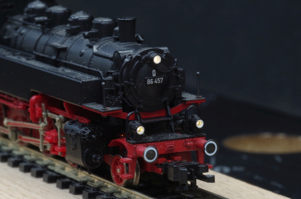 Hier eine Fleischmann BR86 (7086), die es bei EBAY gab. Die Lok hat nur ein 3-Licht Spitzensignal vorne, da das Fahrgestell mit der Motoraufnahme bis hinten ans Gehäuse geht und