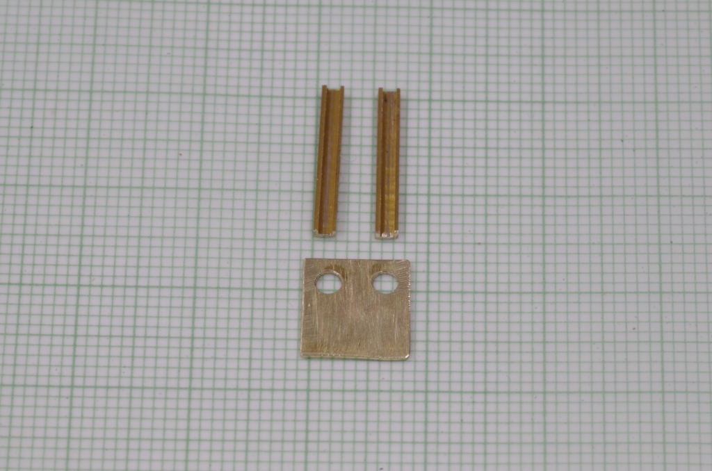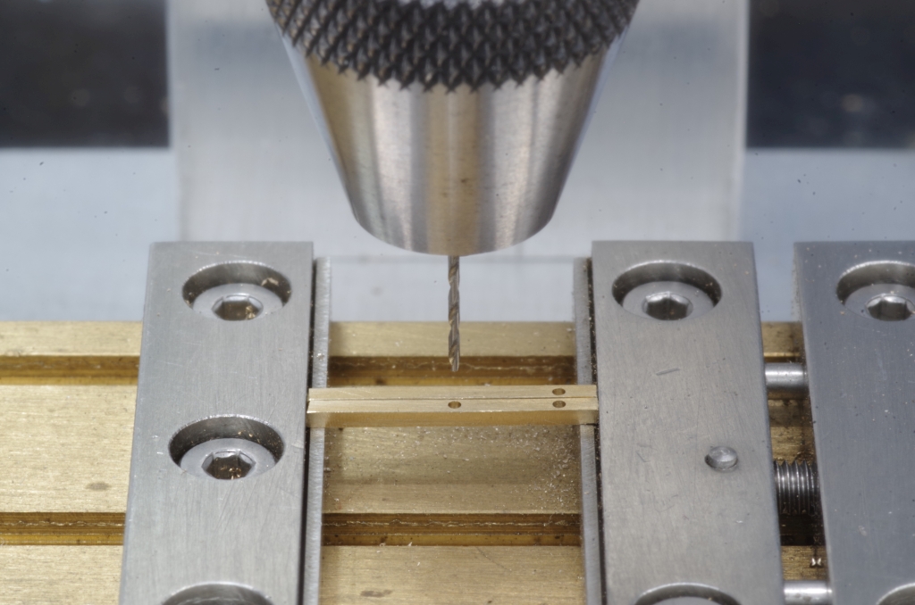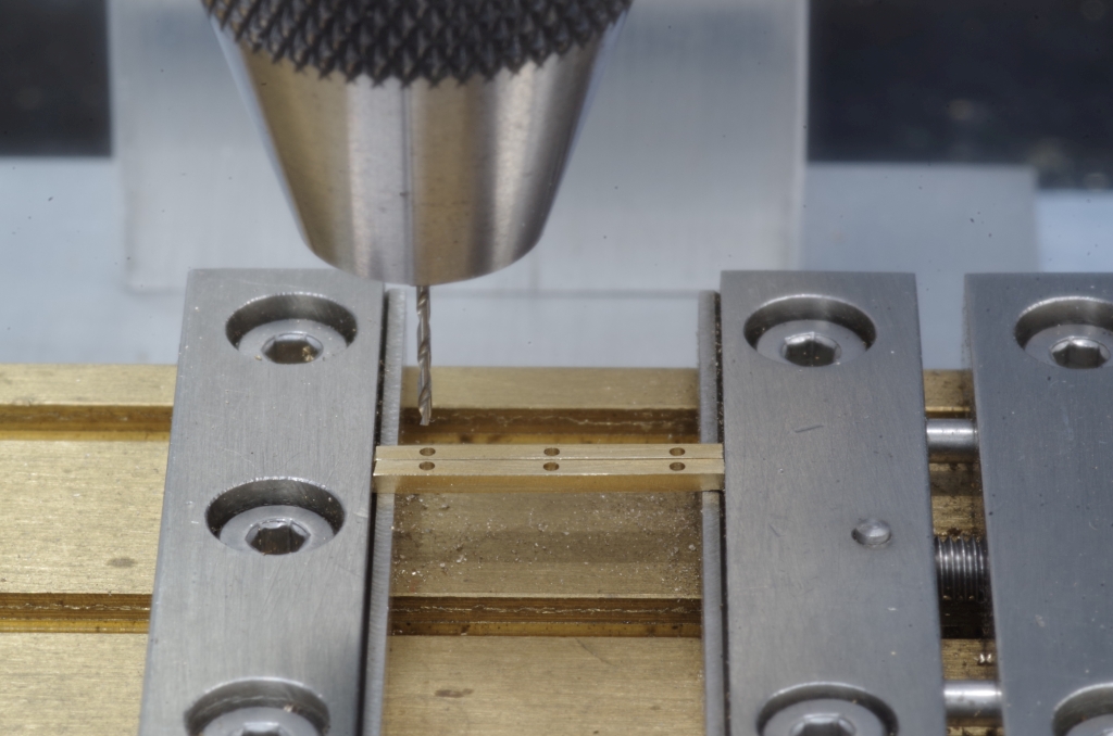 Aus zwei passenden Messing Flachprofilen wurde das Führungsteil gemacht, hier werden gerade die 0,56 mm Löcher für Neusilberdraht gebohrt.