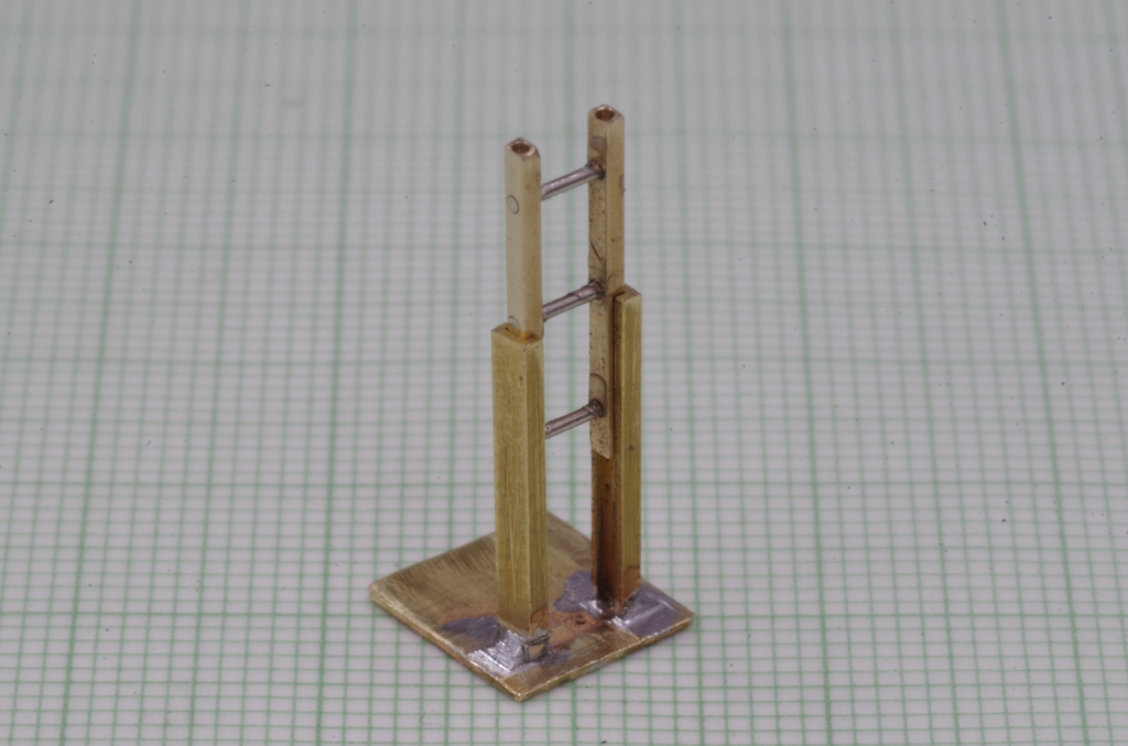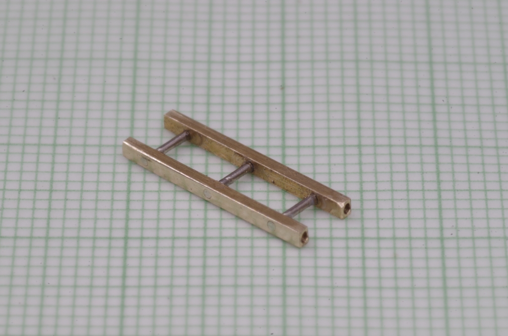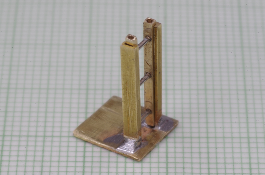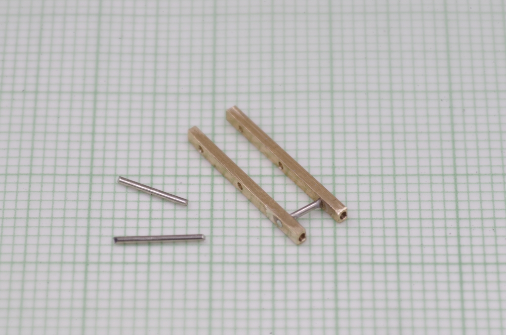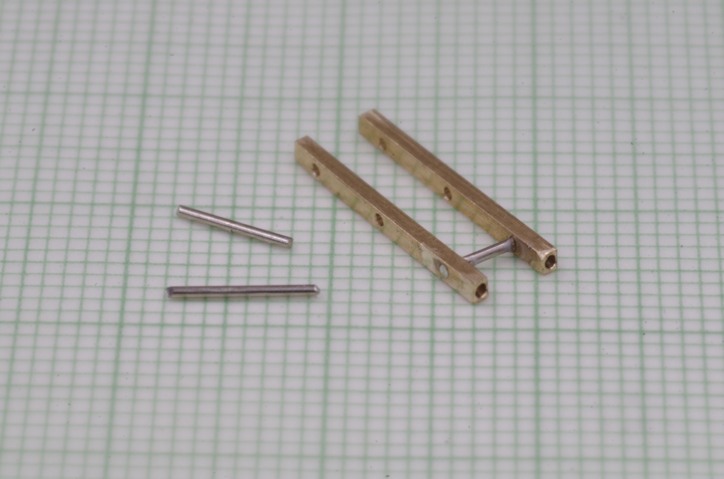 Die beiden Teile werden in passendem Abstand mit Neusilberdraht verbunden, dieser wird mit Sekundenkleber eingeklebt. An der Stirnseite befinden sich auch zwei Bohrungen.