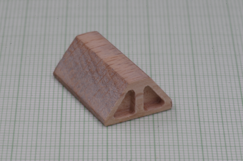 Vor längerer Zeit hatte ich den Turmtriebwagen von Minitrix gekauft (12465). Minitrix hat ihn dann nochmal mit einem Fahrleitungsbauwagen (und Sound) herausgebracht (16992). Angeregt von einem Beitrag auf 1zu160.net (https://www.1zu160.net/scripte/forum/forum_show.php?id=1402222&sb1=turmtriebwagen#x1403484) habe ich versucht, einen Fahrleitungsbauwagen selbst zu bauen. Ausgangspunkt ist ein Niederbordwagen von Fleischmann (8257K). Zuerst ein Stück Buchenholz in die passende Form für die Kabelrollenträger gebracht.