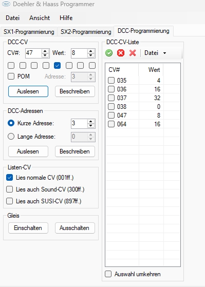 Dort zwei SMD Widerstände 4K7 in der Bauform 0603 einlöten. Den Decoder habe ich so eingestellt :