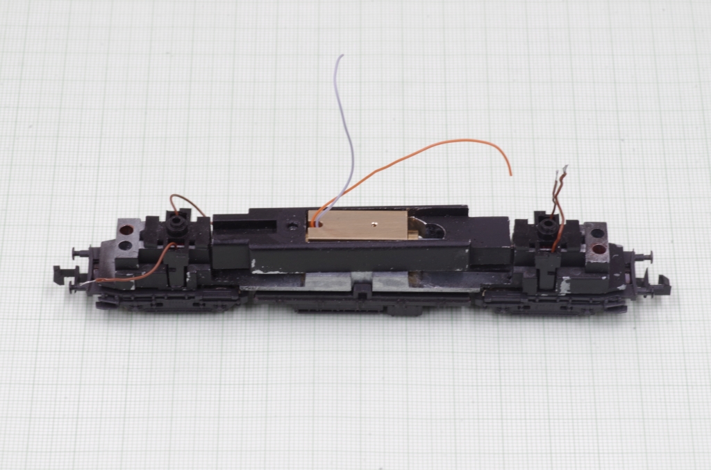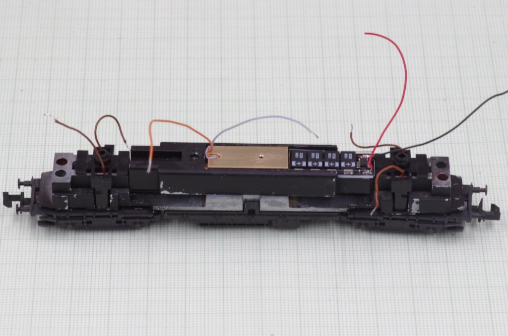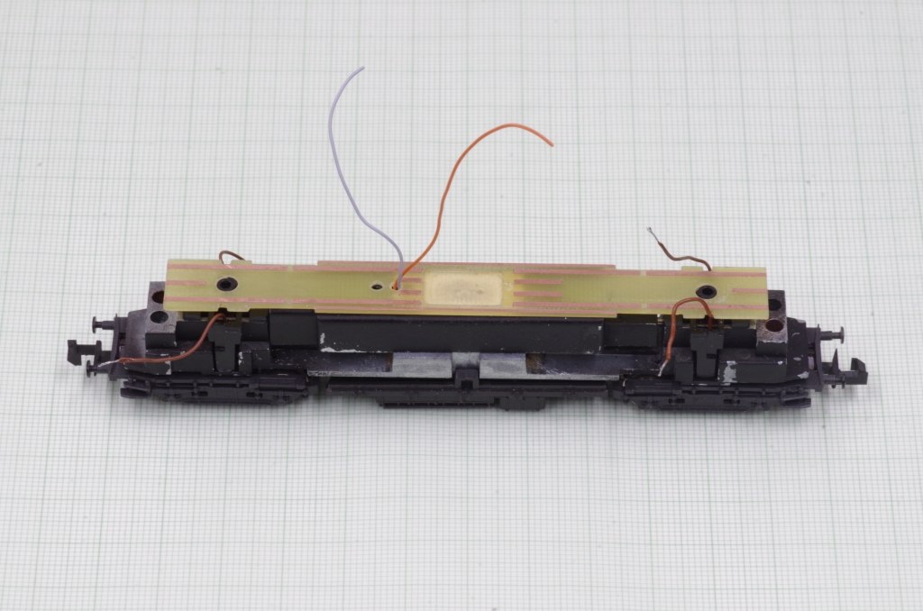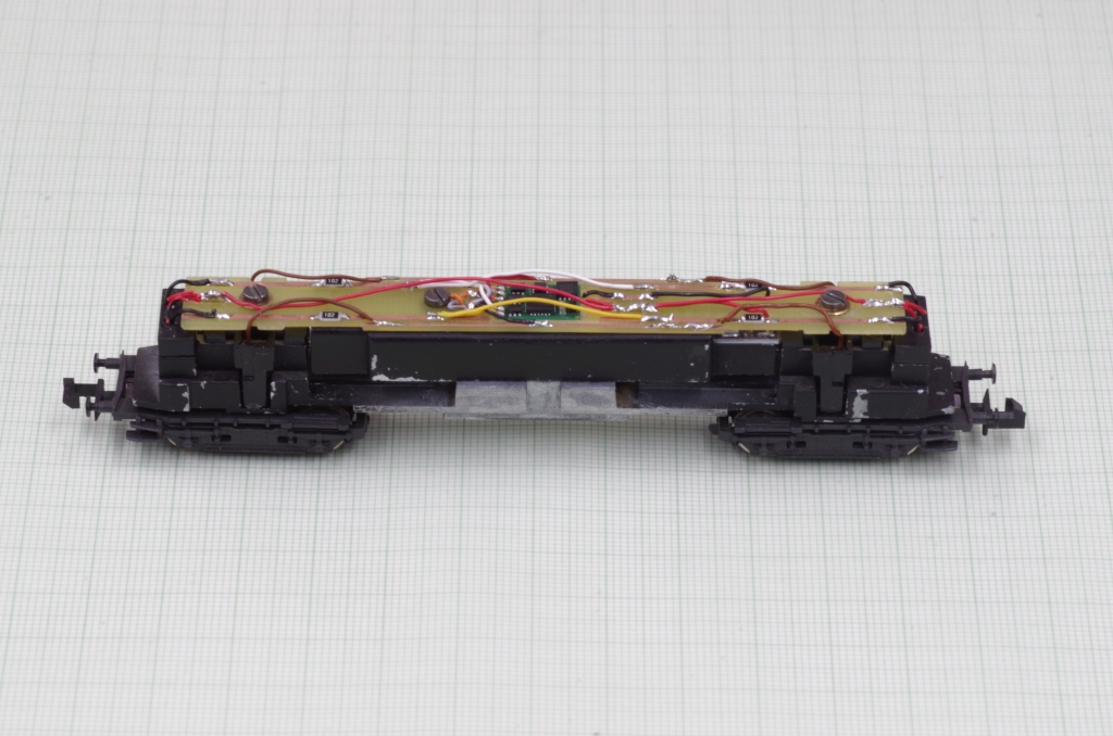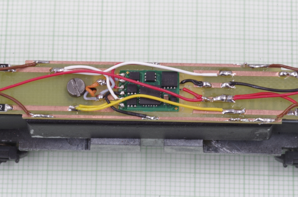 Die andere Platinenseite, die grauen und orangen Kabel sind für den Motor. Die braunen Leitung kommen von den Drehgestellen.