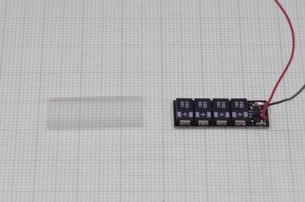 Hier die Seite mit dem Pufferspeicher, er ist über die rote und schwarze Leitung angeschlossen, die Anode aller LEDs mittels der roten Leitungen. In den Zuleitungen der Kathoden