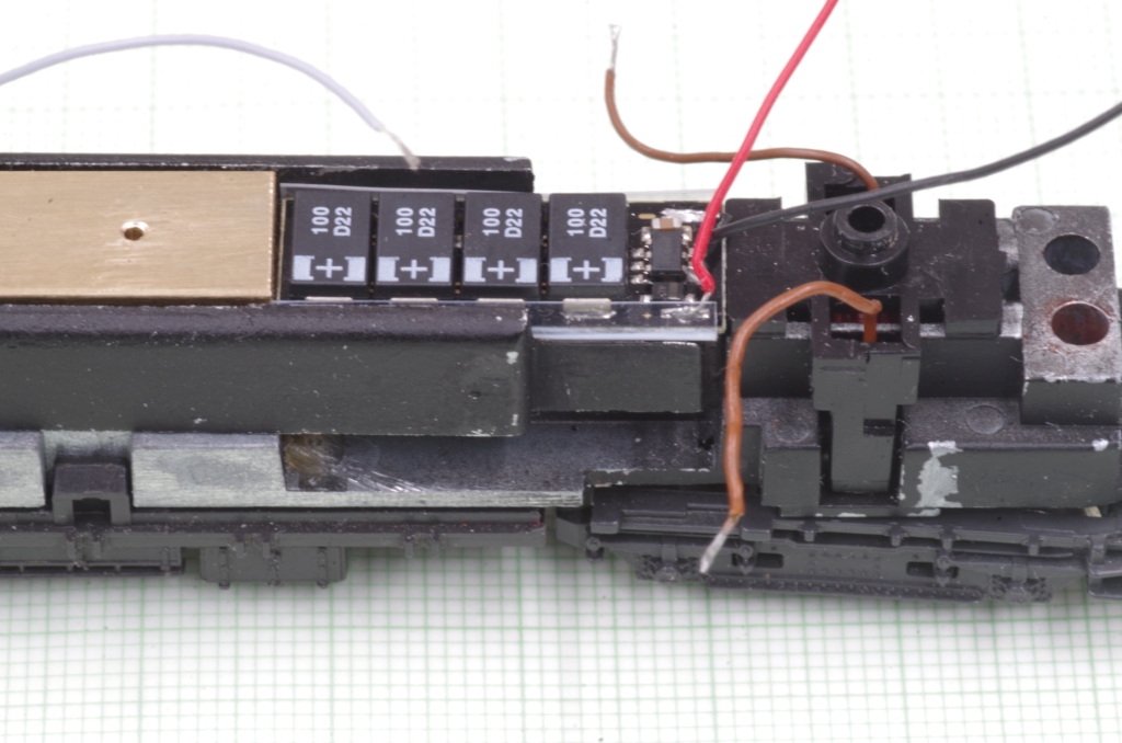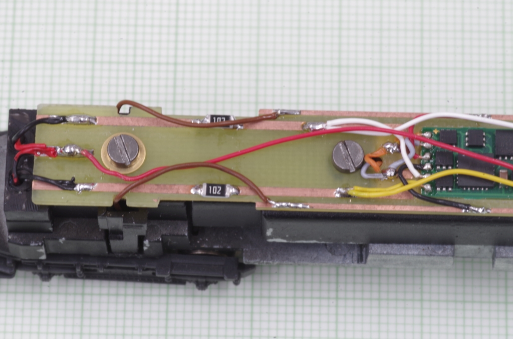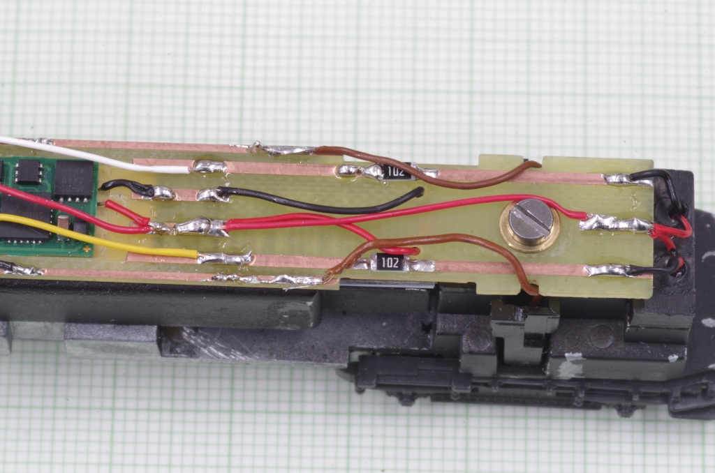 Außer den sechs Leitung für Gleis, Motor und Beleuchtung werden noch die Lötpunkte auf der Decoderunterseite VS und GND verdrahtet (rote und schwarze Leitung). Der Decoder ist ein